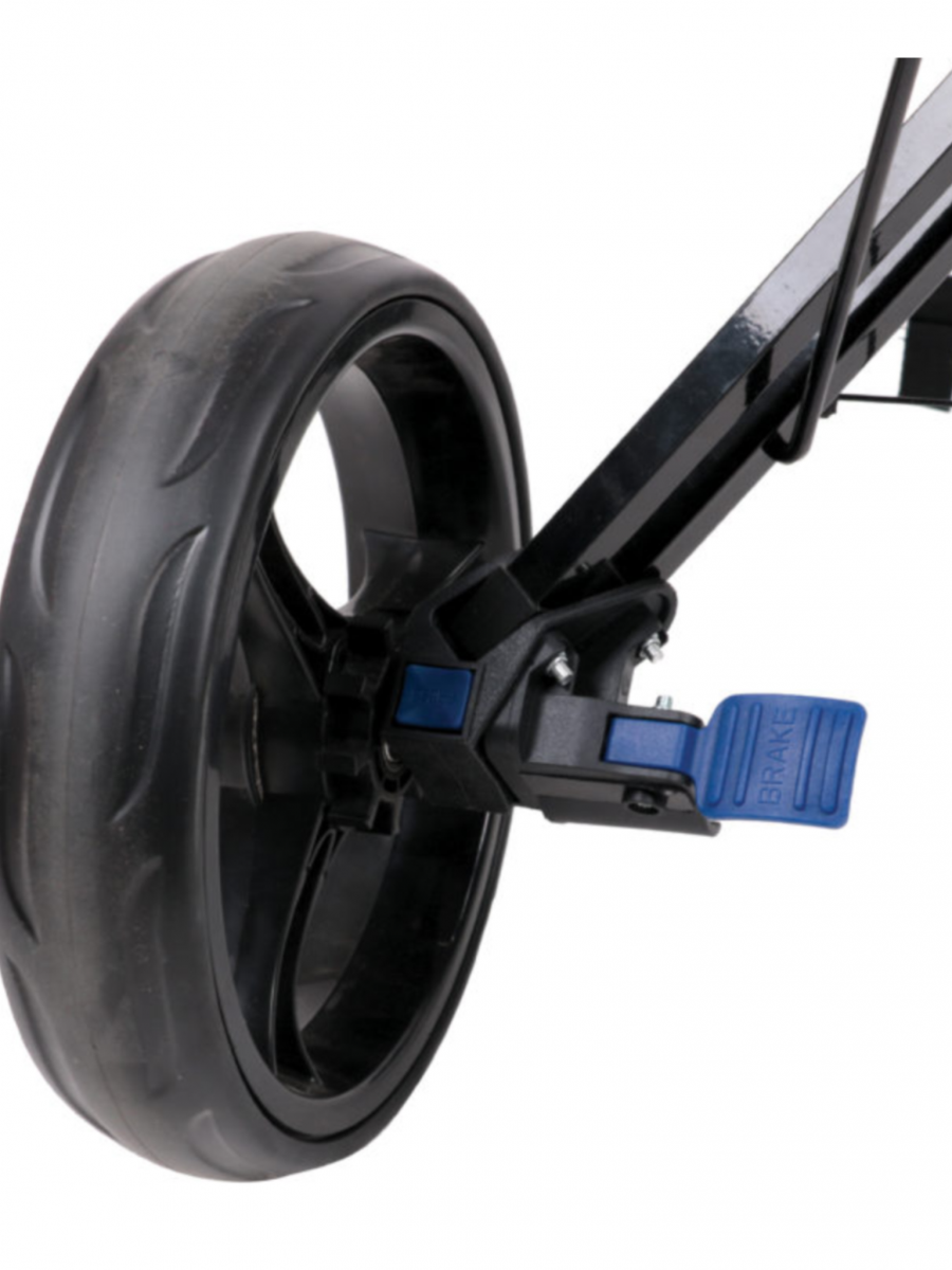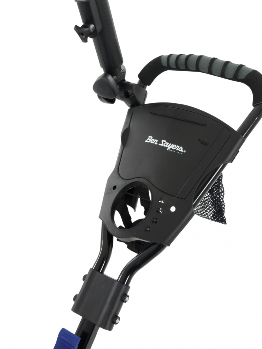 Ergonomic grab handle includes a drinks holder, scorecard holder, tee and ball storage space and a storage compartment for other accessories.