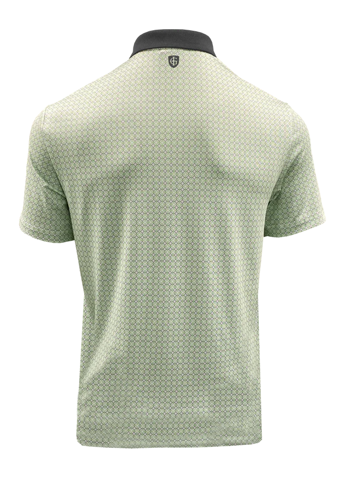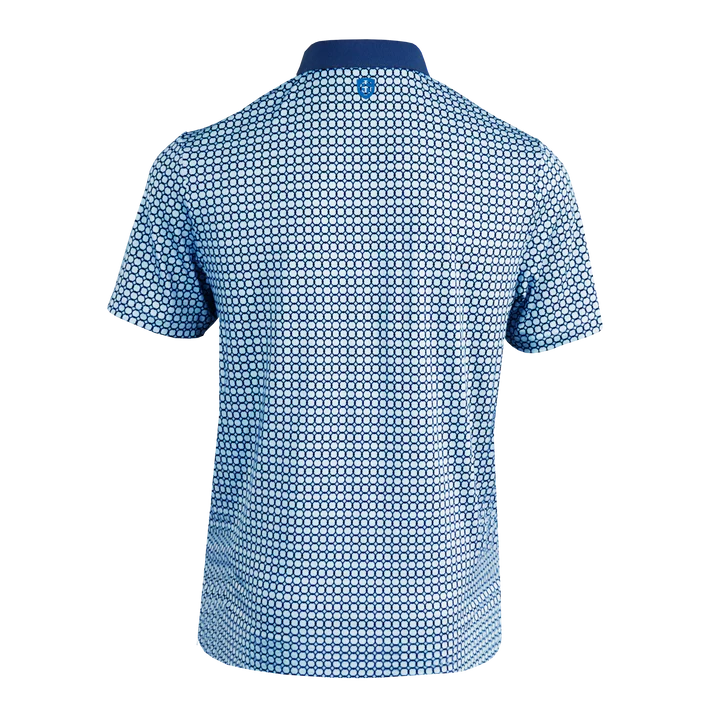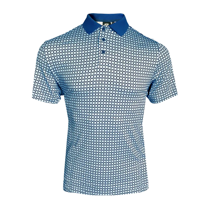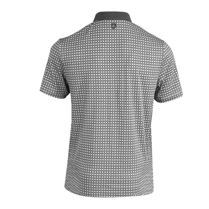 Elevate your golf style with this Men’s Polo Shirt featuring a distinctive all-over chain print. Designed with 4-way stretch jersey knit fabric, it offers breathable comfort, UV protection, and moisture-wicking finishes. The ribbed contrast collar adds a refined touch, perfect for on and off the course.