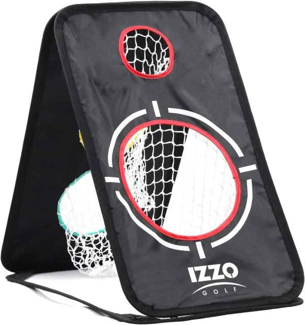 In Golf, improving your short game can quickly lower your score, and The IZZO Golf A-Frame Golf Chipping Net is the perfect Golf training aid to help. The chipping is designed with 5 different size holes to hone your chipping skills, ranging in size from 9.5 inches to 4 inches in diameter. The A-Frame Chipping Net is made of a durable nylon canvas and is supported by sturdy metal frame. This chipping net folds up flat for easy storage and measures 24’’ x 15’’ x .5’’ when flat and comes with a nylon carry bag. Move the chipping net farther away to help improve your distance and accuracy or set it up and play a game with friends or family. The net is perfect for practicing chipping in the backyard but can also be used indoors with foam practice balls. The IZZO Golf A-Frame Chipping Practice Net is the perfect golf training aid accessory to help improve your short game.